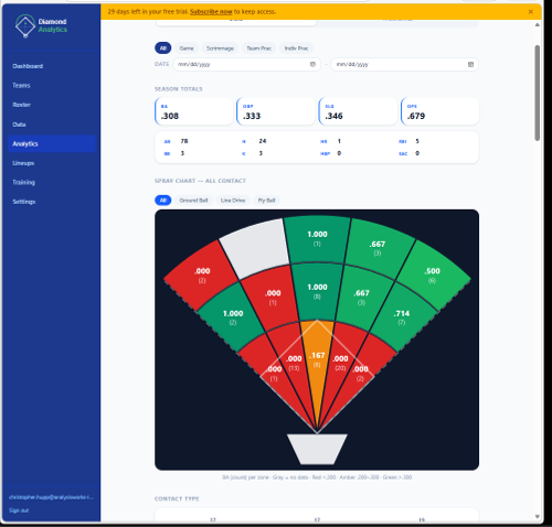 The Diamond Analytics App is a mobile-friendly tool designed to help coaches, parents, and players improve performance through real-time data tracking and analysis. It allows users to record stats for hitting, pitching, fielding, and base running during practices, games, or scouting sessions using simple keypad forms. The app provides real-time analytics, dashboards, and reports for deeper insights, supports team management and secure data access, and enables the creation of personalized training plans based on analytics. Its goal is to make advanced performance evaluation accessible and practical for youth baseball and softball programs.